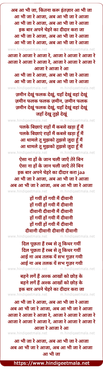 Lyrics of Aa Bhi Ja Re Aaja - अब आ भी जा आजा