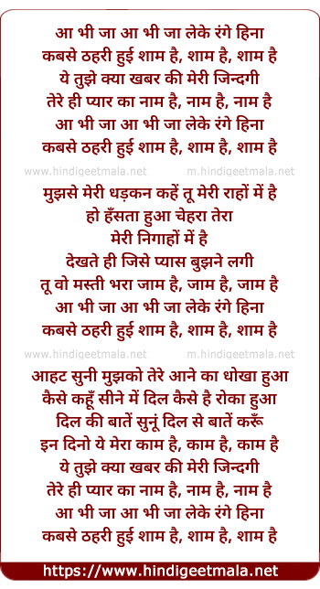Lyrics of Aa Bhii Jaa Leke Range Heena - आ भी जा लेके रंगे हिना
