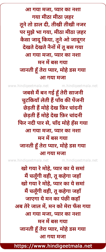 Lyrics of Aa Gaya Maza Pyar Ka Nasha - आ गया मजा प्यार का नशा