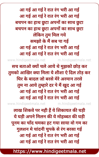 Lyrics of Aa Gayi Re Raat Rangbhari Aa Gayi - आ गई रे रात रंग भरी आ गई