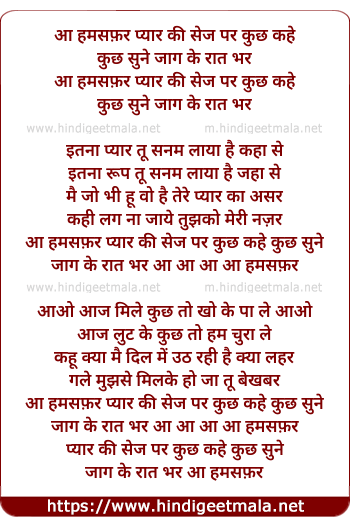 Lyrics of Aa Hamsafar Pyaar Kee Sej Par - आ हमसफ़र प्यार की सेज पर