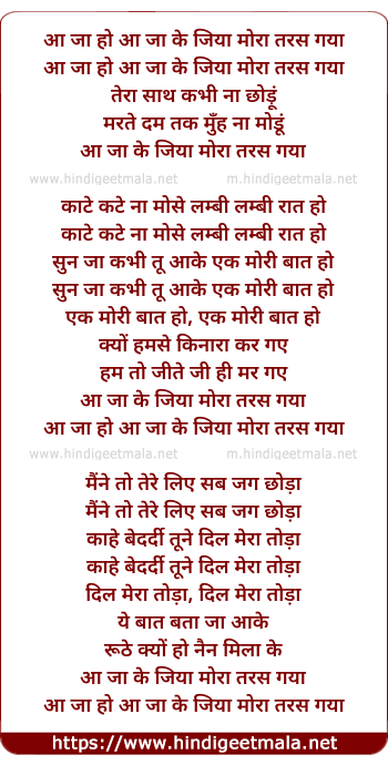 Lyrics of Aa Ja Ke Jiya Mora Taras Gaya - आ जा हो आ जा के जिया मोरा तरस गया