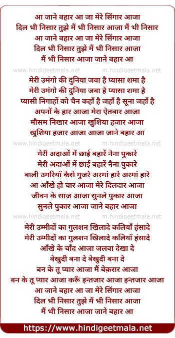 Lyrics of Aa Jane Bahaar Aa Ja - आ जाने बहार आ जा