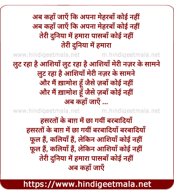 Lyrics of Aab Kaha Jaye Ki Apna Mehrbaan Koi Nahi - अब कहाँ जाएँ कि अपना मेहरबाँ कोई नहीं