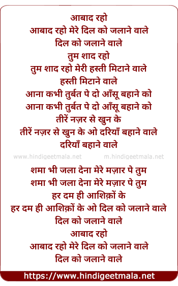 Lyrics of Aabaad Raho Mere Dil Ko Jalaane Waale - आबाद रहो मेरे दिल को जलाने वाले