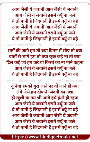 Lyrics of Aag Jaise Yeh Jawani, Isame Kyun Naa Jale - आग जैसी ये जवानी आग जैसी ये जवानी