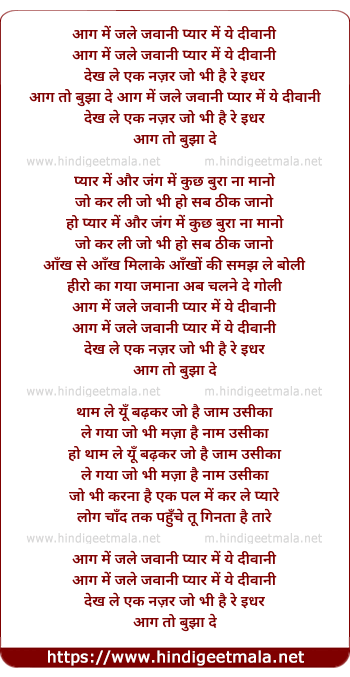 Lyrics of Aag Me Jale Jawaani - आग में जले जवानी