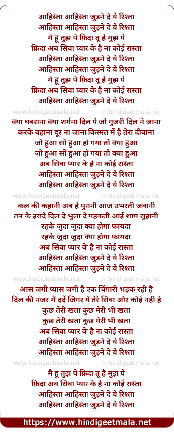 Lyrics of Aahista Aahista Jhudne De Ye Rishta - आहिस्ता आहिस्ता जुड़ने दे ये रिश्ता
