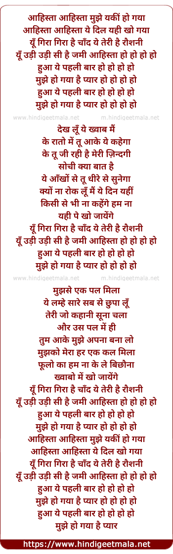 Lyrics of Aahista Aahista Mujhe Yakin Ho Gaya - आहिस्ता आहिस्ता मुझे यकीं हो गया