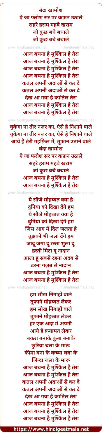 Lyrics of Aaj Bachna Hai Mushkil Tera - आज बचना है मुश्किल है तेरा