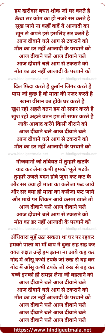 Lyrics of Aaj Deewane Chale Aag Se Takrane - आज दीवाने चले आग से टकराने