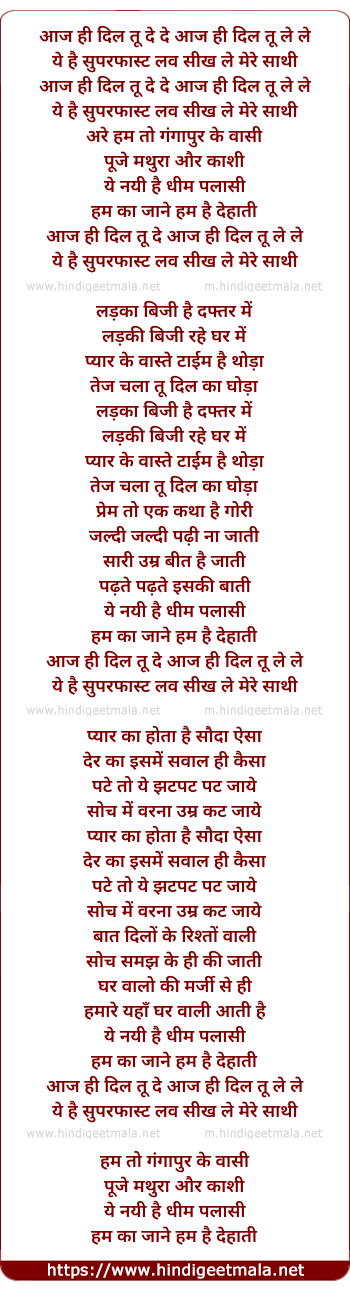 Lyrics of Aaj Hi Dil Tu De (Super Fast Love) - आज ही दिल तू दे (सुपर फ़ास्ट लव)