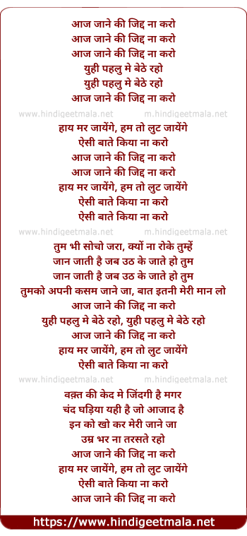 Lyrics of Aaj Jaane Ki Zid Na Karo - आज जाने की जिद्द ना करो