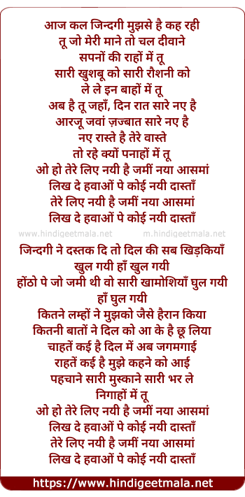 Lyrics of Aaj Kal Jindagi Mujhase Hai Keh Rahi - आज कल जिन्दगी मुझसे है कह रही