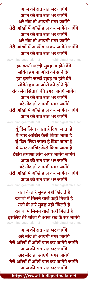 Lyrics of Aaj Ki Raat, Raat Bhar Jaagenge - आज की रात, रात भर जागेंगे