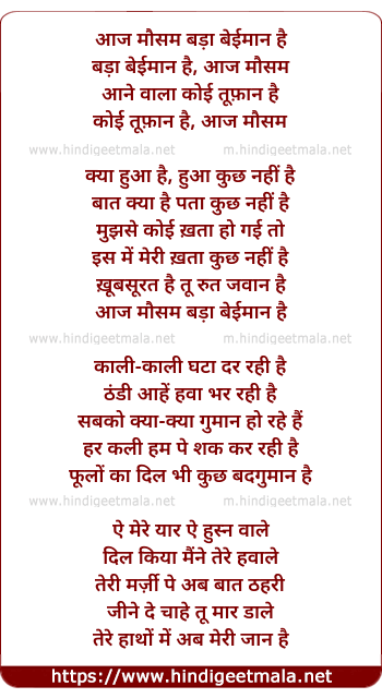 Lyrics of Aaj Mausam Bada Baiman Hai - आज मौसम बड़ा बेईमान है बड़ा