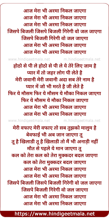 Lyrics of Aaj Mera Bhi Armaan Nikal Jayega - आज मेरा भी अरमां निकल जायेगा