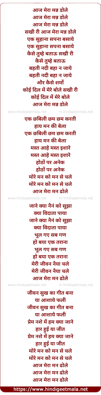 Lyrics of Aaj Mera Mann Dole Re - आज मेरा मन डोले रे