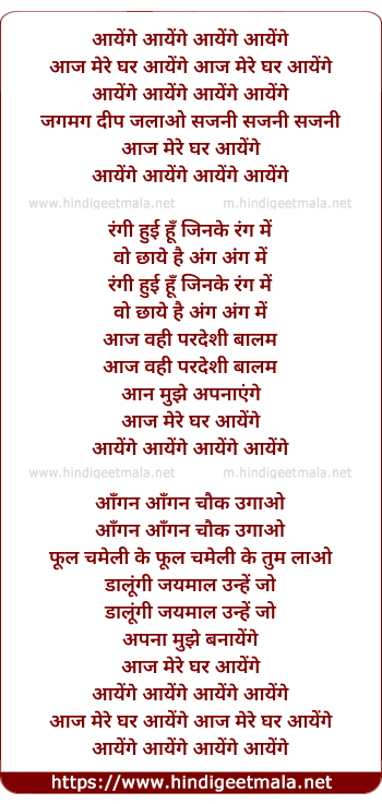 Lyrics of Aaj Mere Ghar Aayenge - आयेंगे आयेंगे आयेंगे आयेंगे
