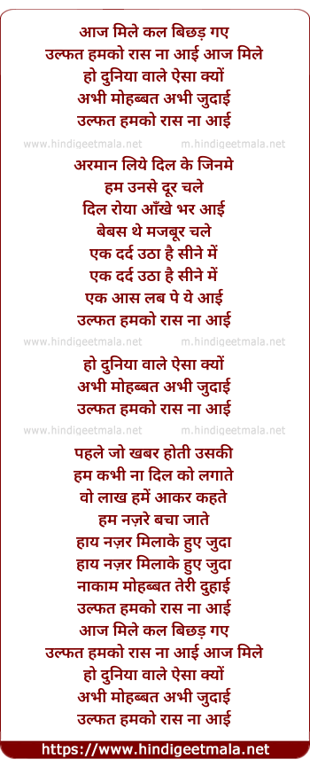 Lyrics of Aaj Mile Kal Bichad Gaye - आज मिले कल बिछड़ गए