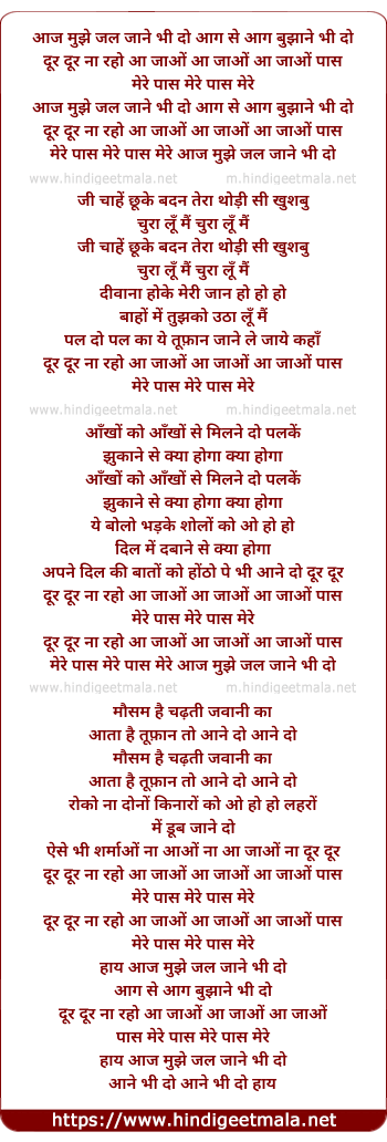 Lyrics of Aaj Mujhe Jal Jaane Bhi Do - आज मुझे जल जाने भी दो आग से आग बुझाने भी दो