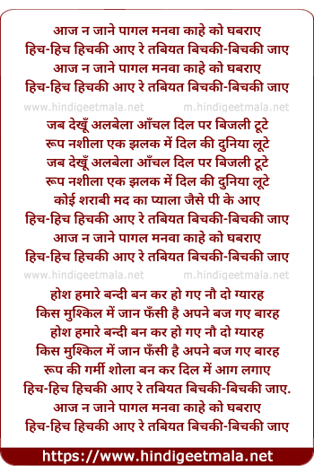Lyrics of Aaj Naa Janey Pagal Manwa Kahe Ko Ghabraye - आज न जाने पागल मनवा काहे को घबराए