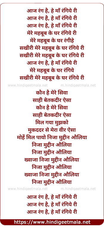 Lyrics of Aaj Rang Hain - आज रंग है, हे माँ रंगिये री