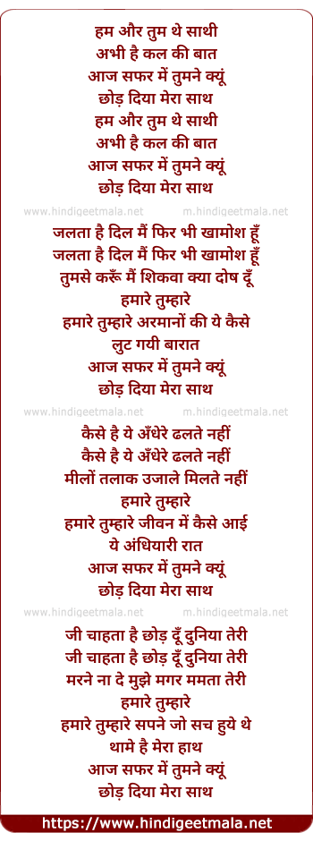 Lyrics of Aaj Safar Me Tumne Kyu Chhod Diya Mera Sath - आज सफर में तुमने क्यूं छोड़ दिया मेरा साथ
