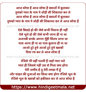 Lyrics of Aaj Socha Hai Khayalo Me Bula Kar Tumko - आज सोचा हैं ख्यालों में बुला कर तुमको