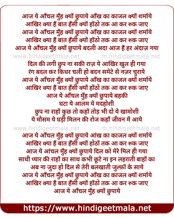 Lyrics of Aaj Ye Aanchal Munh Kyu Chhupaye - आज ये आँचल मुँह क्यों छुपाये