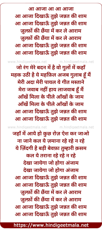 Lyrics of Aaja, Dikhaaon Tujhe Jannat Ki Shaam - आजा, दिखाऊं तुझे जन्नत की शाम