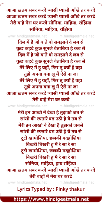 Lyrics of Aaja Khatam Sabr Kar De - आजा खत्म सबर करदे