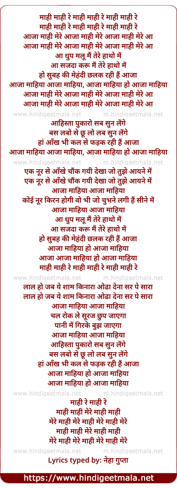 Lyrics of Aaja Mahee Mere, Aaja Mahiya - आजा माही मेरे, आजा माहिया