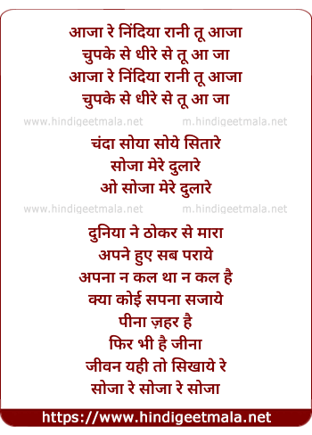 Lyrics of Aaja Re Neendiya Rani Tu Aaja, Chupke Se Dhire Se Aaja - आजा रे निंदिया रानी तू आजा, चुपके से धीरे से आजा