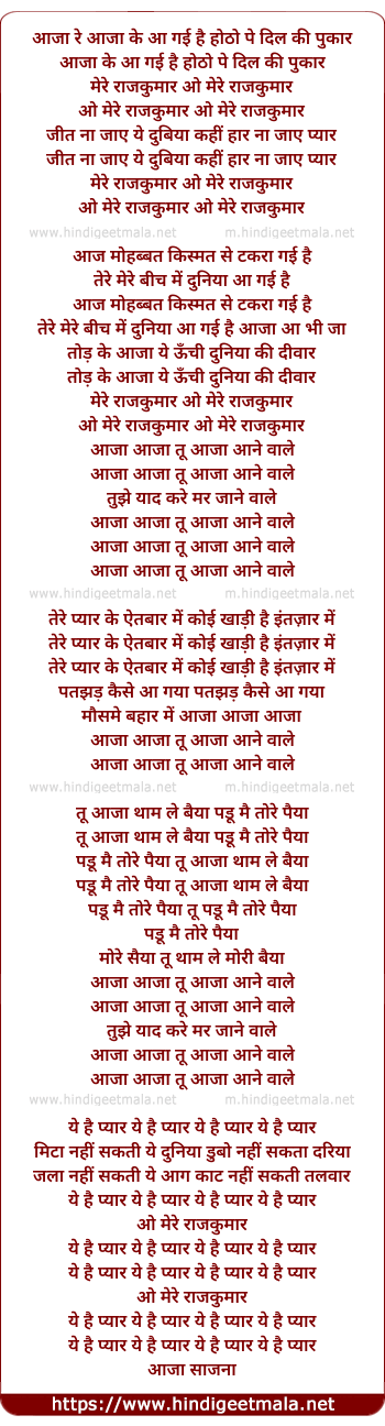 Lyrics of Aaja Ke Aa Gayi Hotho Pe Dil Ki Pukar Mere Rajkumar - आजा के आ गई है होठो पे दिल की पुकार मेरे राजकुमार