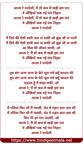 Lyrics of Aaja Re Perdeshi, Main To Kab Se Khadi Is Paar - आजा रे परदेशी, मैं तो कब से खड़ी इस पार
