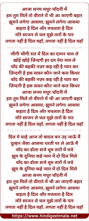 aaja sanam madhur chandni me ham tum mile to virane me bhe aa jaye gi bahaar,jhoomne lage ga aasman,kehta he dil aor machalta he dil mre sajan le chal mujhe taron ke paar,lagta nahi he dil yahaan,bheegi bheegi rat me ka daman thaam le,khoi khoi zindagi har dam tera nam le,chand ki behki nazar,keh rahi he piar kar,zindagi he ik safar,kon jane kal kidhr,dil ye chahe aaj to badal ban urr jaoon me,dulhan jesa aasman dharti pr le aaon me.chand ka dola sajey,dhoom taron me mache,jhoom k dunia kahe,