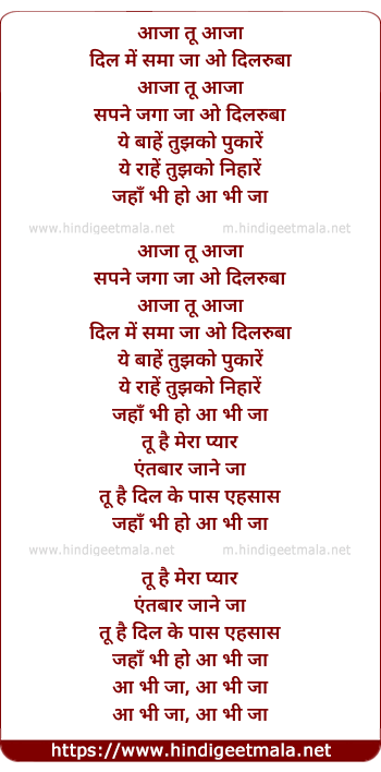 Lyrics of Aaja Tu Aaja - आजा तू आजा