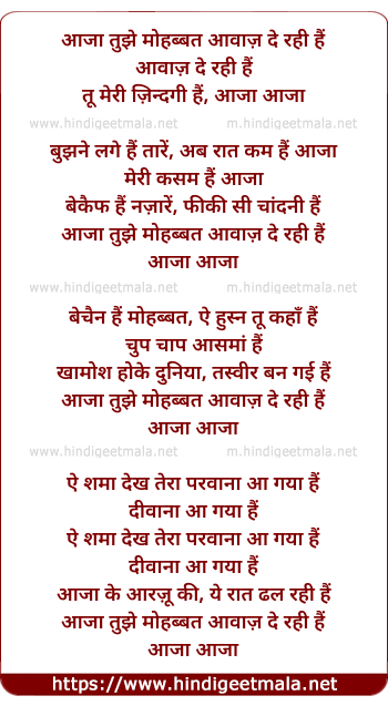 Lyrics of Aaja Tujhe Mohabbat Aawaj De Rahi Hai - आजा तुझे मोहब्बत आवाज़ दे रही हैं