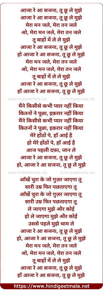 Lyrics of Aaja Re Aa Sajana, Tu Chhu Le Mujhe - आजा रे आ सजना, तू छू ले मुझे