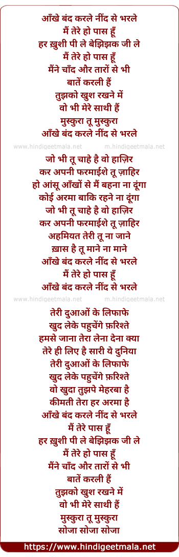Lyrics of Aakhe Band Karle Nind Se Bharle - आँखे बंद करले नींद से भरले