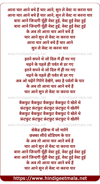 Lyrics of Aana Char Aane Bache Hai Char Aane - आना चार आने बचे हैं चार आने