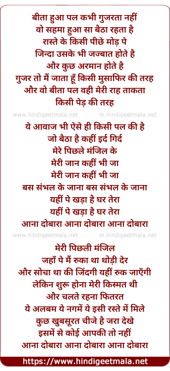 Lyrics of Aana Dobaara - बीता हुआ पल कभी गुजरता नहीं