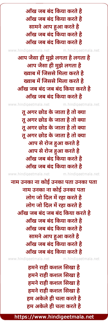 Lyrics of Aankh Jab Bandh Kiya Karte Hai - आँख जब बंद किया करते है