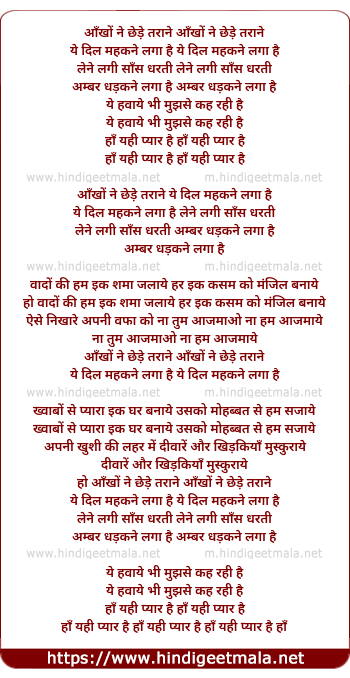 Lyrics of Aankho Ne Chede Taraane - आँखों ने छेड़े तराने आँखों ने छेड़े तराने