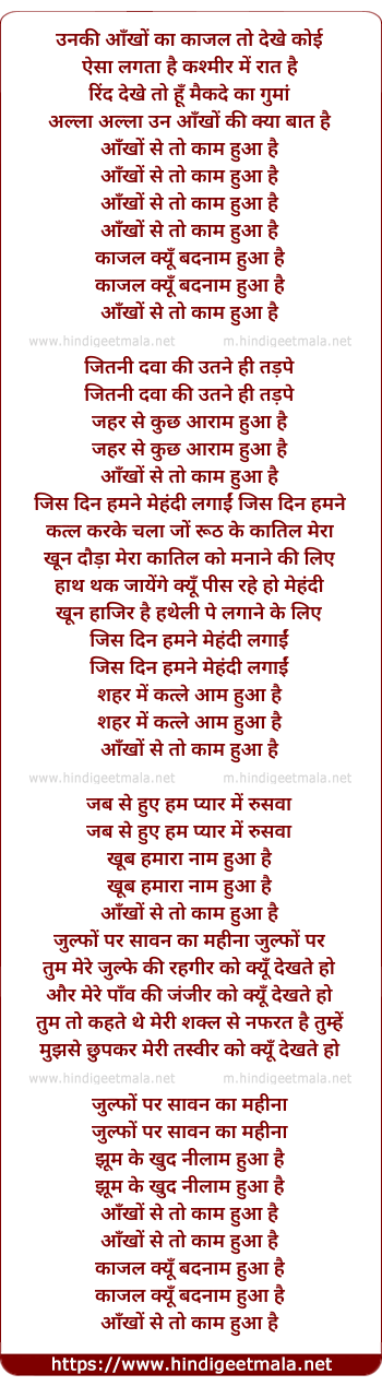 Lyrics of Aankho Se To Kaam Hua Hai - उनकी आँखों का काजल तो देखे कोई