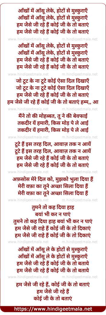 Lyrics of Aankhon Mein Aansoon Leke, Hoton Se Muskuraye - आँखों में आँसू लेके, होटों से मुस्कुराएँ