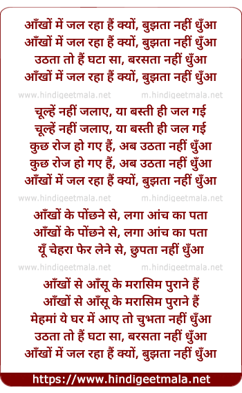 Lyrics of Aanko Me Jal Raha Hai Kyu - आँखों में जल रहा हैं क्यों, बुझता नहीं धुँआ