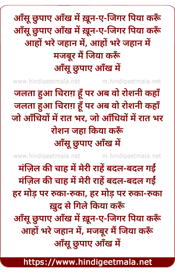 Lyrics of Aansu Chhupaaye Aankh Mein Khun-E-Jigar Piya Karu - आँसू छुपाए आँख में ख़ून-ए-जिगर पिया करूँ