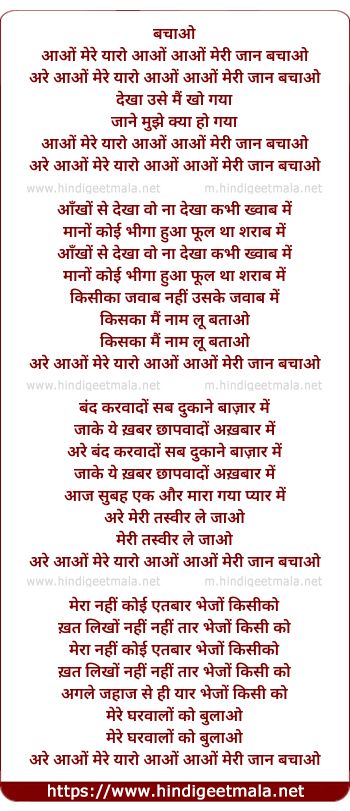 Lyrics of Aao Mere Yaro Aao, Aao Meri Jan Bacho - आओं मेरे यारो आओं, आओं मेरी जान बचाओं